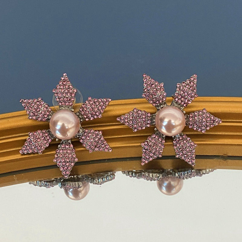 Weihnachts-Schneeflocken-Edelstein-Ohrringe, farbenfrohe, mit rosa Diamanten besetzte Perlenohrringe